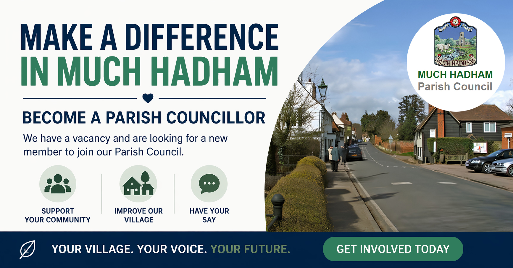 The next Parish Council meeting will take place on Tuesday 5th May 2026 at Much Hadham Village Hall.